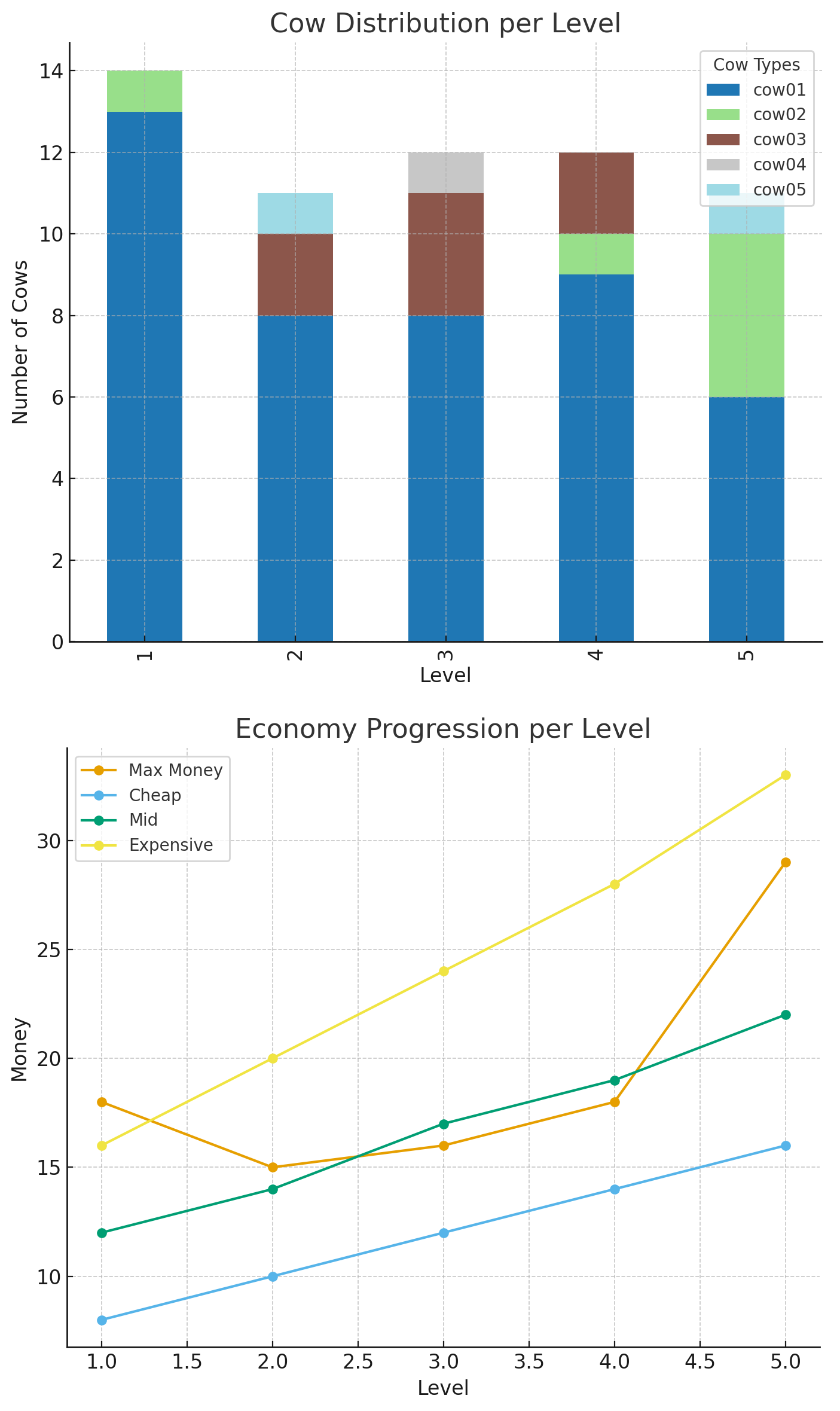 I approached balancing with a structured, data-driven process. Using a spreadsheet, I tracked cow distribution and values, then combined this with playtest data on average player earnings. I also categorized players with Bartle’s Player Types framework, adapted into hardcore, casual, and mid-core groups.