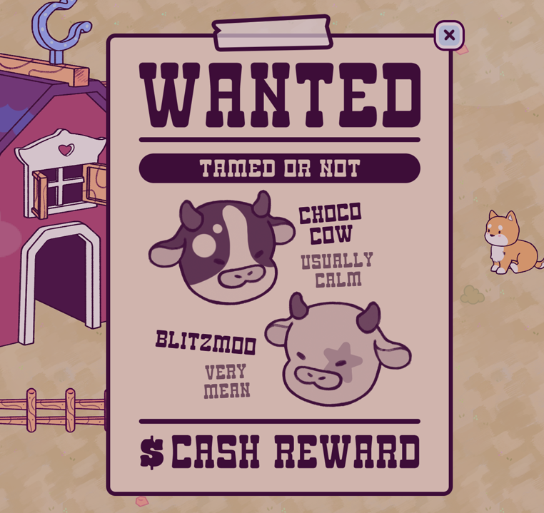 The cow mechanics were a true team effort. Ideas flowed quickly, and since I was responsible for programming, I translated accepted ideas into diagrams to understand how they connected with other systems and to align them with the same learning curve. To prepare players, each day featured a wanted panel of cows with short descriptions of behaviors they had not yet encountered, which made discovery and progression more intuitive.