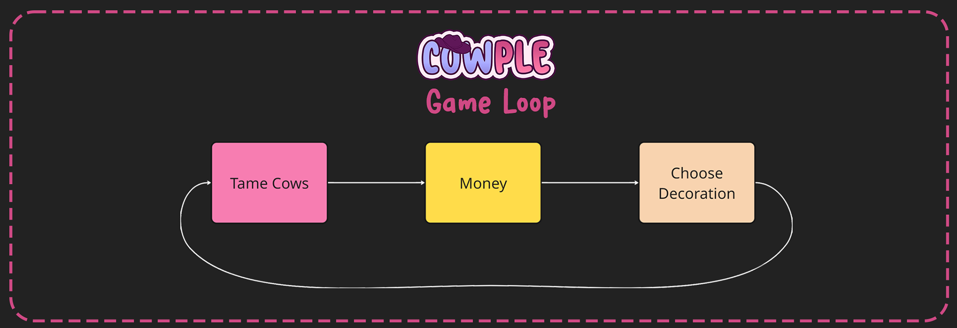 When I worked on "Cowple" my main focus was on the game loop, cow mechanics, balancing, and the tame system. The game loop was built to deliver a cozy experience, with just enough challenge to make completing the wedding with the best decorations rewarding, but also forgiving enough so players could always buy something and never feel soft-locked.